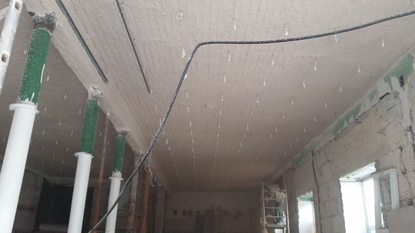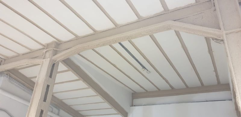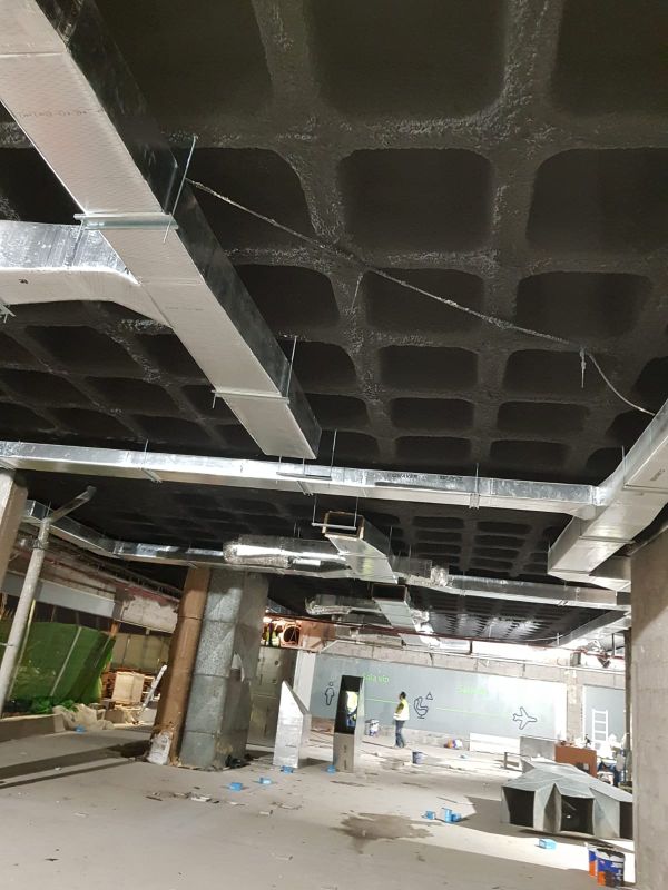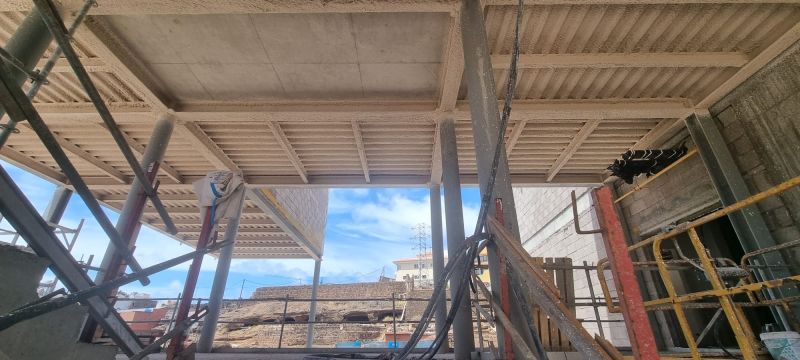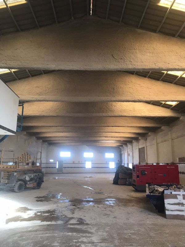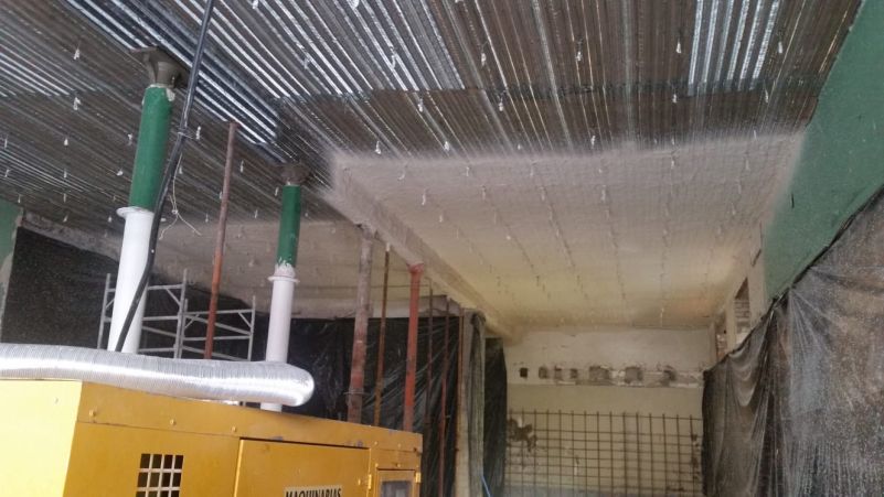 Realizamos la aplicación de mortero ignífugo mediante proyección mecánica para la ejecución de todos los sistemas constructivos para los que el material está ensayado, tanto para protección estructural de acero al igual que la intumescente, como para estructuras y forjados de madera, forjados reticulares, colaborantes, formación de barreras medianeras, trasdosados. Y también en combinación con malla nervometal en los casos en el que el sistema lo requiere.